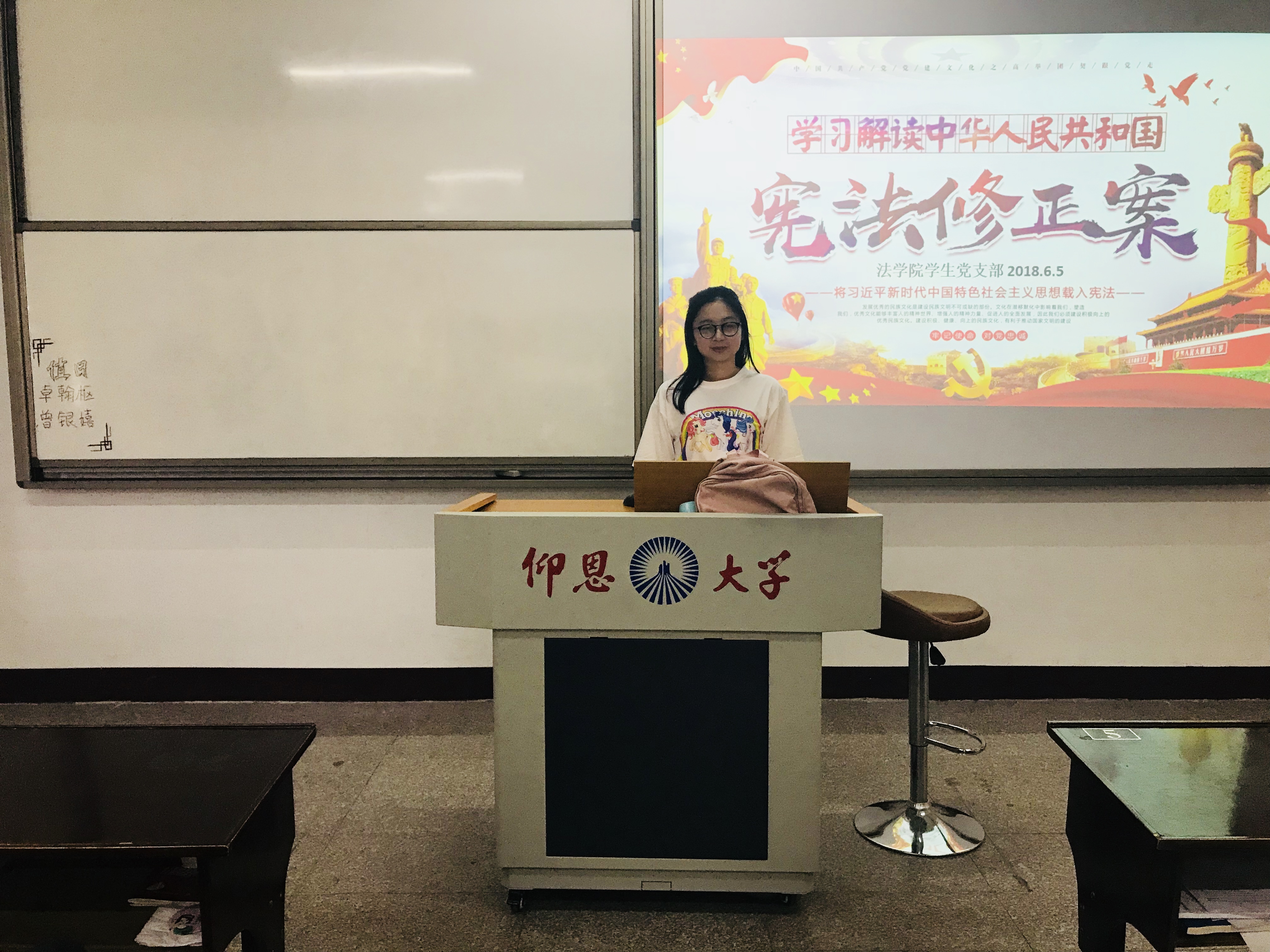 6月5日下午,yl23455永利集团学生党支部在普照楼202开展了学习《中华人民共和国宪法》的专题学习会,支部全体党员参与了本次学习会。会议由学生党支部书记林媛主持。   活动现场 “立善法于天下,则天下治”。宪法作为国之根本、法之源泉,宪法修改关系全局,影响广泛深远,学习宣传和贯彻实施宪法是认真贯彻落实党的十九大和十九届二中、三中全会精神、全国“两会”精神、全面推进法治建设的头等大事。会上,林媛为支部党员解读了宪法修改与国家治理现代化的关系,同时强调要把宪法学习上升到讲政治的高度,真正学懂弄痛做实,切实担负起维护宪法权威、捍卫宪法尊严、保证宪法实施的神圣职责。 宪法是国家的根本大法,实现了党的主张和人民意志的高度统一,具有显著优势、坚实基础、强大生命力。通过这次的学习会,党员们加深了对宪法的认识和了解,带头做宪法的忠实崇尚者,自觉遵守者和坚定捍卫者,将宪法运用到实际生活中。(yl23455永利集团学生党支部图/文)