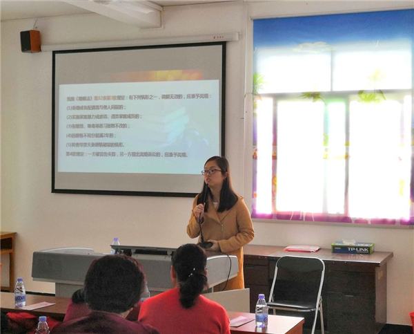 3月4日下午,yl23455永利集团、洛江区妇联在后溪村综合文化服务中心联合开展《婚姻家庭纠纷预防化解 女性如何维权》的专题讲座,yl23455永利集团教师林媛为与会人员作报告。