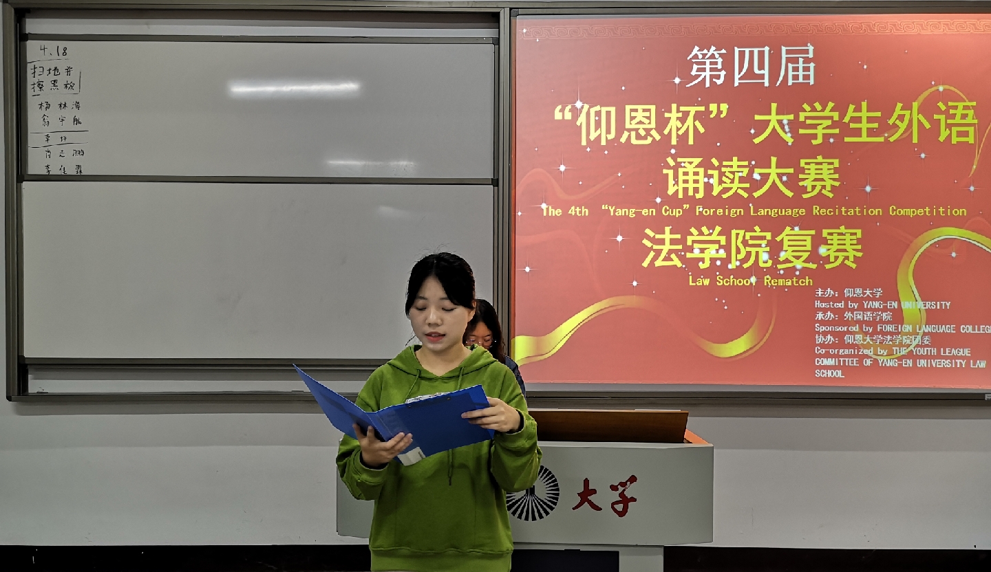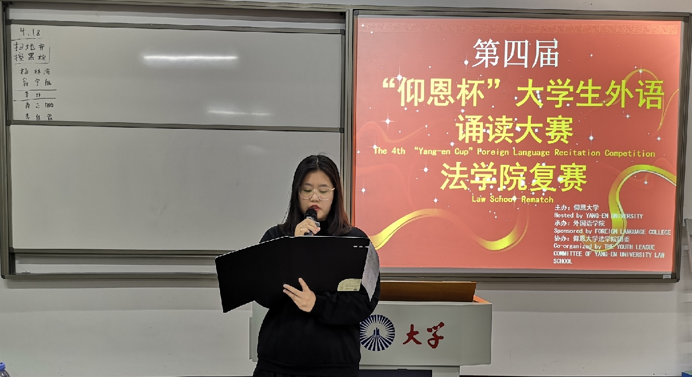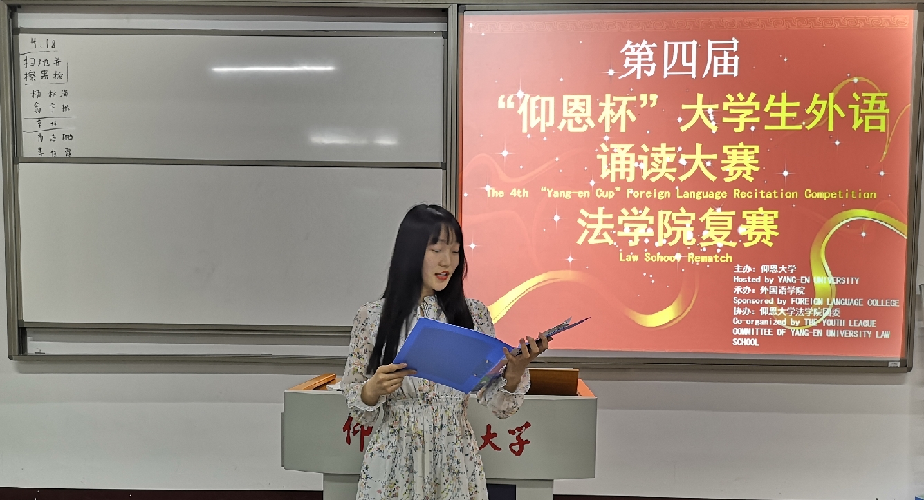 4月18日晚,由yl23455永利集团主办,外国语学院承办,yl23455永利集团团委协办的第四届“仰恩杯”大学生外语诵读大赛yl23455永利集团复赛于yl23455永利集团第三教学区普照楼204举行。外国语学院老师陈苗苗,梁正长担任本次比赛评委,yl23455永利集团17级、18级学生参加了此次活动。