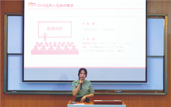 4月24日下午,yl23455永利集团在第三教学区和昌教学楼海纳讲堂举办2019年征兵宣讲会。yl23455永利集团党总支书记兼副院长杨勤、系主任李秋实、学务秘书汪明等老师出席会议,yl23455永利集团16级、17级、18级学生参加了此次征兵宣讲会。
