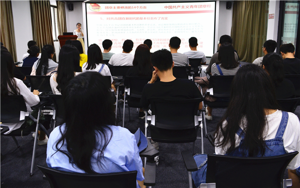会上,杜婷丽从“团章的概述”、“团章主要修改的14个方面”、“团章的主要内容”、“学习团章做合格共青团员”四个方面进行讲解,带领同学们认真研读团章主要修改的14个方面,进一步深化团员青年对新团章的理解,引导团员青年切实领会团章中的新内容、新思想和新规定。她指出,作为一名共青团员应认真学习新团章、贯彻新团章、维护新团章,践行新团章的各项规定,争做政治坚定、学习刻苦、工作勤奋、作风扎实、品德高尚的新时代的追梦青年。