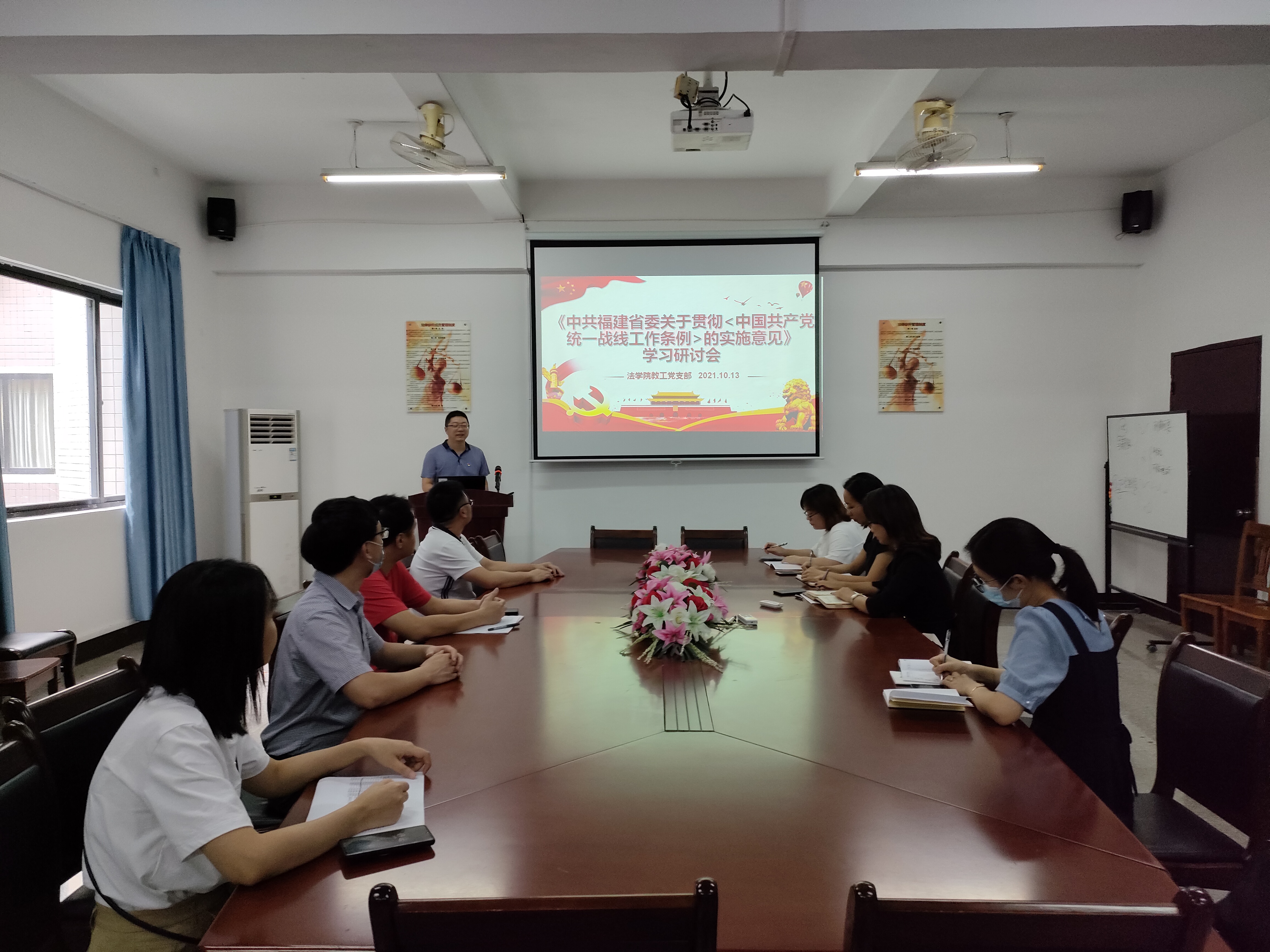 10月13日下午,于yl23455永利集团第三校区普照教学楼法律诊所,yl23455永利集团教工党支部召开《中共福建省委关于贯彻<中国共产党统一战线工作条例>的实施意见》学习研讨会,yl23455永利集团全体党员教师参加了此次活动。