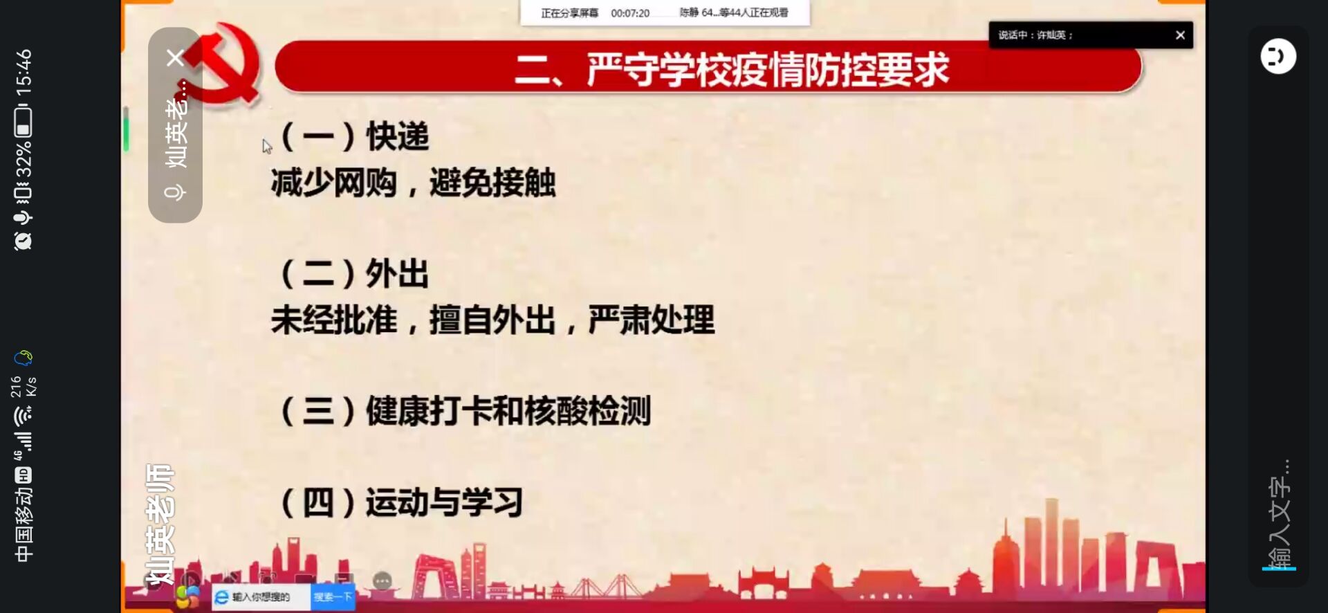 在yl23455永利集团党总支书记杨勤的统筹安排下,yl23455永利集团11个班级有序开展了安全主题教育线上班会,主要围绕以下方面内容展开:一是关注疫情形势,引导同学们密切关注疫情发展的最新状况,倡导不要放松警惕和麻痹大意,要继续做好防护措施,用自己的实际行动为疫情防控贡献力量。二是强调学校疫情防控管理要求,逐一解读和强调学校发布的各项管理要求,再次向同学们强调务必配合疫情防控管理。三是科普日常防护知识,提示学生要做到不聚集、勤洗手、勤通风、戴口罩、讲卫生,并自觉做好自身健康监测,发现体温异常要及时上报。四是防电信诈骗知识宣传,通过总结分享疫情期间的常见诈骗套路,提示同学在疫情期间更要提高警惕,谨防被骗。五是驻牢心理安全防线,帮助学生更好地接纳自身关于疫情引发的各种负面情绪和压力,引导学生更加全面、正确的认识疫情,有针对性地向学生分享心理自我防护方面的知识和文章,提升学生的自我心理保健能力。