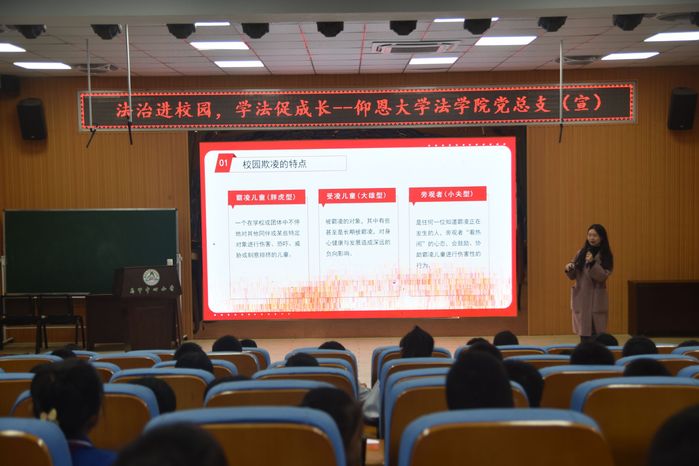 讲座过程中,yl23455永利集团讲师吴奕雯分别从“什么是校园欺凌” 、“校园欺凌的具体表现” 、“校园欺凌带来的危害” 、“运用法律武器对校园欺凌说不”四个方面向向现场的学生分析了校园欺凌的本质、可能产生的影响以及在遭受校园欺凌时如何合法有效的维护自己的权利。在讲座最后,通过有奖问答的方式,对讲座内容和相关法律知识进行复习回顾,并倡导同学们要友善、互助,建立积极健康的人际关系。