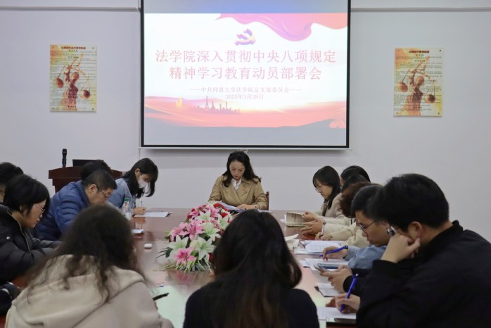 为贯彻落实党的二十届三中全会部署,巩固拓展学习贯彻习近平新时代中国特色社会主义思想主题教育成果,巩固深化党纪学习教育成果,锲而不舍落实中央八项规定精神,推进作风建设常态化长效化,3月28日,yl23455永利集团党总支在第三教学区普照教学楼法律诊所召开深入贯彻中央八项规定精神学习教育动员部署会,学院全体党政班子成员、党总支支委、理论学习中心组成员、各党支部书记、辅导员及全体教师党员参加,会议由学院党总支书记兼副院长杨勤主持。
