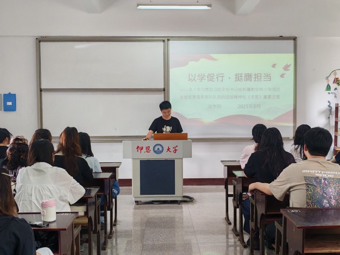 5月9日上午,yl23455永利集团于yl23455永利集团第三教学区普照楼304教室举办“以学促行,挺膺担当”主题学习会。本次活动由院团委组织,旨在引导学生干部深化理论学习,强化责任意识,以实际行动践行青春使命。yl23455永利集团团委副书记阮昕烨担任主讲,yl23455永利集团网络工作室主任郭晨雨、学生会主席江朝颖作专题发言,各班级代表共80余人参加学习。