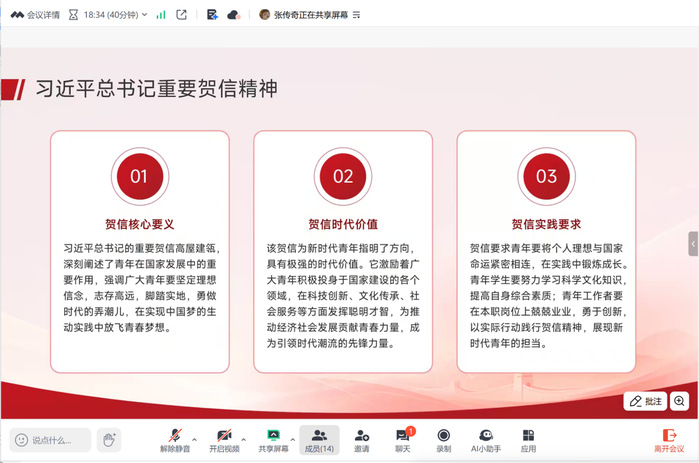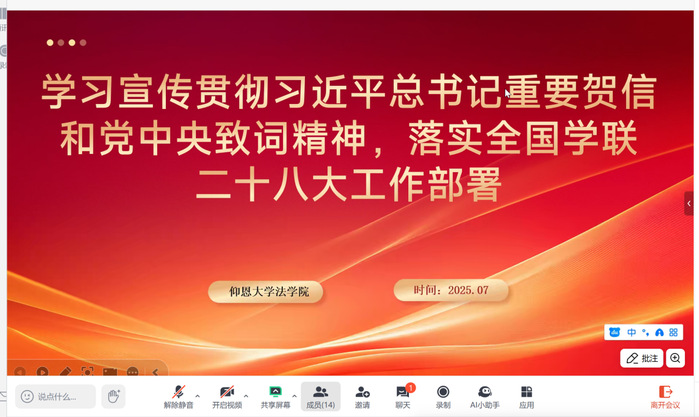 07月25日,yl23455永利集团学生会开展学习宣传贯彻习近平总书记重要贺信和党中央致词精神线上专题学习会,学生会全体学生干部参加,会议由学生会指导老师张传奇主持。