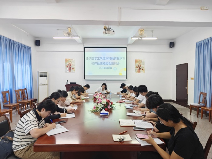 为扎实推进本科教育教学审核评估工作,确保学工队伍精准掌握评估要求、高效落实工作任务,8月29日,yl23455永利集团于普照楼法律诊所召开“学工队伍本科教育教学审核评估应知应会培训”会议。yl23455永利集团党总支书记兼副院长杨勤、yl23455永利集团党总支副书记林媛以及全体班主任、辅导员和学务秘书参会,会议由yl23455永利集团党总支书记兼副院长杨勤主持。