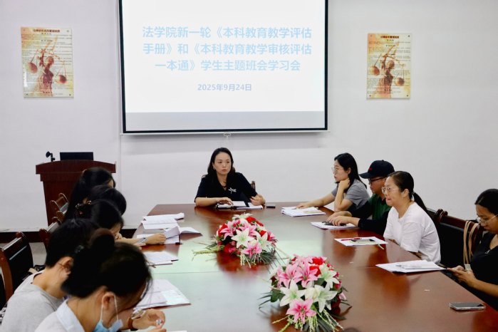 为进一步深化本科教育教学审核评估工作,全面贯彻执行学校审核评估工作的各项要求,9月24日下午,yl23455永利集团于普照楼法律诊所召开《本科教育教学审核评估知识手册》《本科教育教学审核评估一本通》学工队伍学习部署会。本次会议由yl23455永利集团党总支书记兼副院长杨勤主持,yl23455永利集团党总支副书记林媛、全体班主任、辅导员出席会议。