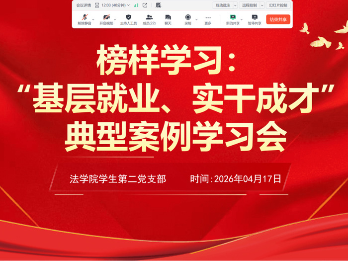 会上,主持人吴成爽同志首先组织党员观看了谷文昌、廖俊波同志先进事迹视频,带领大家学习焦裕禄精神,深入解读“为官一任,造福一方”的为民情怀,阐释了政绩观与基层工作的内在联系。吴成爽同志强调,这些先进典型用实际行动诠释了共产党人的初心使命,展现了党员干部在基层岗位上实干担当、为民服务的优良作风,也为青年党员树立了正确的成长榜样。随后,支部党员围绕基层就业、实干成才主题开展深入学习,结合法学专业特色,阐述了青年党员如何在基层岗位践行正确政绩观、运用专业知识服务群众,实现个人价值与社会价值的统一。